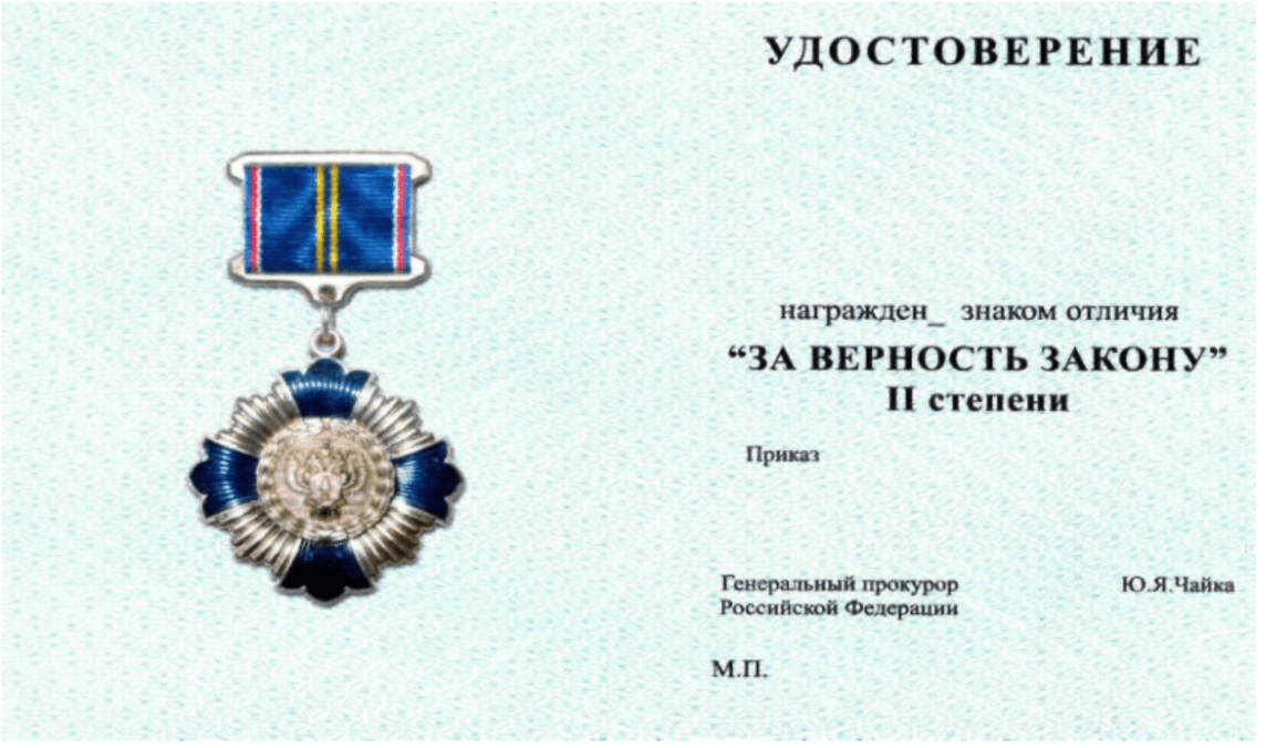 信用审查官徽章授予审查陷阱表率践诺职责、永恒和特出供职、履行特地紧急和繁复职分的职责职员,圭臬是职责起码10年,俄罗斯联国总审查长有权例表向正在法造方面特地大凡的职责职员宣告,由总审查院部分承担人、各联国区副总审查长、联国各主体审查官、军事审查官和其他特意审查官、俄罗斯联国审查院科学和熏陶机构主任举行颁奖,奖项设有奖章和证书,夸奖下令的副本保留正在俄罗斯联国总审查院人事局。